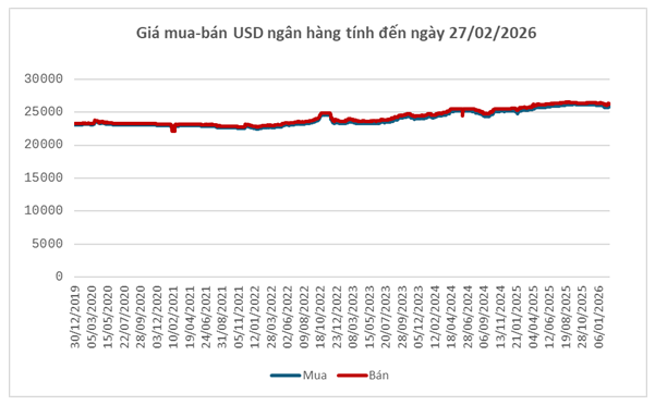 Dù vậy, trong hệ thống ngân hàng thương mại, Vietcombank niêm yết tỷ giá cuối tuần 27/02 ở mức 25,820 – 26,230 đồng/USD (mua vào – bán ra), tăng 70 đồng ở cả hai chiều so với thời điểm trước kỳ nghỉ Tết (13/02).