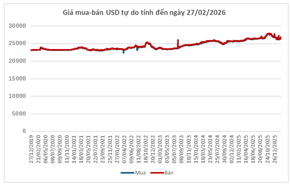 Trên thị trường tự do, tỷ giá tăng mạnh 370 – 380 đồng/USD so với tuần trước (20/02), lên 26,680 – 26,720 đồng/USD (mua vào – bán ra).
