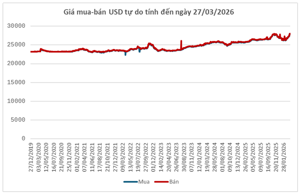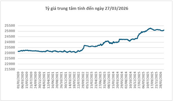 Diễn biến này tiếp tục gây áp lực lên tỷ giá trong nước. Ngày 27/03, Ngân hàng Nhà nước công bố tỷ giá trung tâm ở mức 25,100 đồng/USD, tăng 15 đồng so với cuối tuần 20/03. Với biên độ ±5%, tỷ giá tại các ngân hàng thương mại được phép dao động trong khoảng 23,845 – 26,355 đồng/USD.