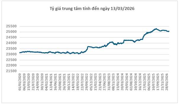 Trong nước, diễn biến tỷ giá USD/VND chịu áp lực từ đà đi lên của đồng USD. Ngày 13/03, Ngân hàng Nhà nước công bố tỷ giá trung tâm ở mức 25,065 đồng/USD, tăng 8 đồng so với cuối tuần trước (06/03). Với biên độ ±5%, tỷ giá tại các ngân hàng thương mại được phép dao động trong khoảng 23,812 – 26,318 đồng/USD.