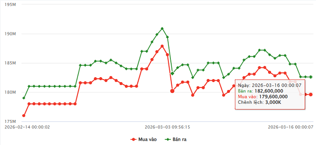 Trong nước, sáng 16/03, giá vàng miếng SJC được công ty SJC niêm yết ở mức 179.6 - 182.6 triệu đồng/lượng ở chiều mua - bán.