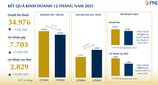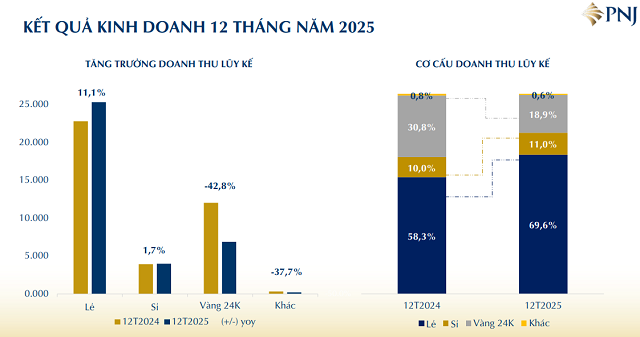 Theo Cục Thống kê - Bộ Tài chính, giá vàng trong nước bình quân năm 2025 tăng 47.67%. Trong bối cảnh giá vàng biến động mạnh, PNJ đạt 34,976 tỷ đồng doanh thu thuần cả năm 2025, giảm 8% so với cùng kỳ; nhưng lợi nhuận sau thuế tăng 34% lên 2,829 tỷ đồng, nhờ mảng trang sức nâng tỷ trọng đóng góp từ 68% lên 81% (gồm 69.6% bán lẻ và 11% bán sỉ). Qua đó, PNJ vượt 44% kế hoạch lợi nhuận sau thuế năm 2025 đã được ĐHĐCĐ thông qua.