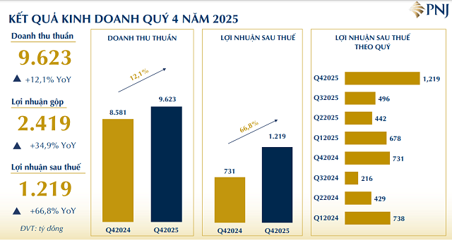 Theo báo cáo kết quả kinh doanh, quý 4/2025, PNJ ghi nhận doanh thu thuần 9,623 tỷ đồng, tăng 12% so với cùng kỳ; lợi nhuận sau thuế đạt 1,219 tỷ đồng, tăng tới 67%.