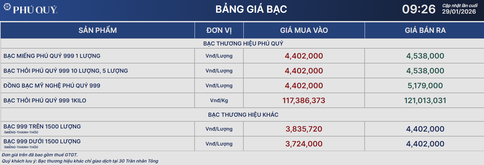 Vẫn tiếp tục đà tăng, giá bạc được Công ty Phú Quý niêm yết ở mức 4.4 - 4.5 triệu đồng/lượng ở chiều mua - bán.