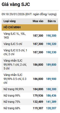 Trong nước, sáng 29/01, Công ty SJC niêm yết giá mua - bán vàng miếng ở mức 187.3 - 190.3 triệu đồng/lượng, trong khi vàng nhẫn cũng theo sát ở mức 186.8 - 189.8 triệu đồng/lượng.