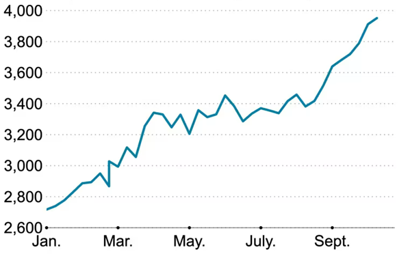 Giá vàng tương lai của Mỹ lần đầu tiên chạm mốc 4,000 USD/oz vào ngày 07/10, tăng vọt gần 50% trong năm nay khi các nhà đầu tư tìm kiếm kênh trú ẩn an toàn cho tài sản trong bối cảnh bất ổn kinh tế và địa chính trị gia tăng.