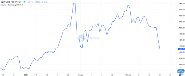 Giá vàng trong nước giảm theo chiều giá vàng thế giới, sáng 19/03, giá vàng thế giới giao ngay giảm hơn 3% xuống còn 4,654.29 USD/oz. Hợp đồng vàng kỳ hạn gần nhất giảm khoảng 5%, xuống 4,648.20 USD/oz.