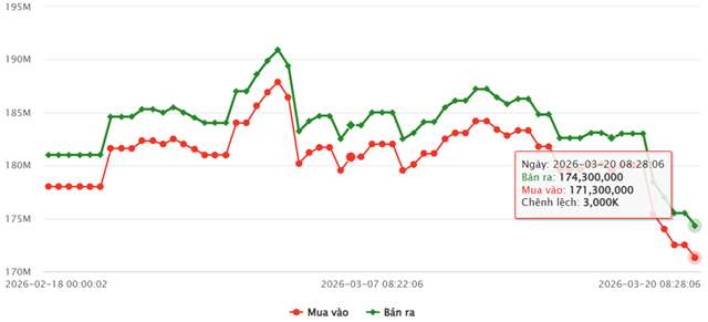 Sáng ngày 20/03, Công ty SJC niêm yết giá vàng miếng ở mức 171.3 - 174.3 triệu đồng/lượng ở chiều mua - bán, giảm 1.2 triệu đồng/lượng mỗi chiều.
