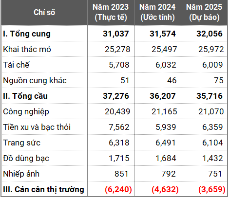 Thứ nhất, thị trường đang đối mặt với tình trạng thiếu cung triền miên. Số liệu cho thấy thế giới đã trải qua 5 năm liên tiếp (2021-2025) mà lượng bạc tiêu thụ vượt xa lượng bạc khai thác được. Riêng năm 2024, mức thâm hụt lên tới gần 149 triệu ounce (hơn 4,600 tấn).