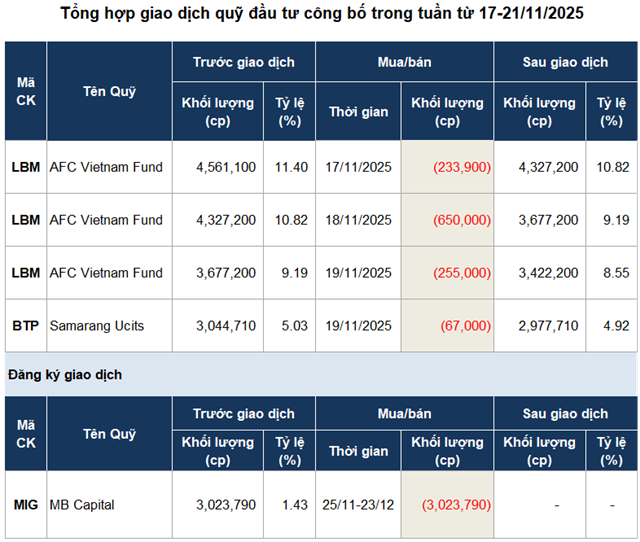 AFC Vietnam Fund là điểm nhấn đáng chú ý khi liên tiếp bán ra cổ phiếu LBM (CTCP Khoáng sản và Vật liệu Xây dựng Lâm Đồng) để cơ cấu danh mục. Quỹ đã bán 233,900 cp trong ngày 17/11; 650,000 cp ngày 18/11 và 255,000 cp trong phiên 19/11. Sau ba phiên, AFC giảm tỷ lệ sở hữu tại LBM từ 11.4% xuống còn 8.55% (tương đương gần 3.4 triệu cp). Ước tính theo giá đóng cửa các phiên này, quỹ thu về khoảng 43 tỷ đồng.