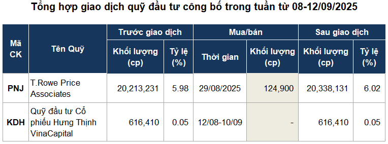 Ở một diễn biến khác, tuần qua T. Rowe Price Associates báo cáo đã mua 124,900 cp PNJ (CTCP Vàng bạc Đá quý Phú Nhuận) vào cuối tháng 8, nâng tỷ lệ sở hữu lên hơn 6%, tương đương hơn 20 triệu cp.