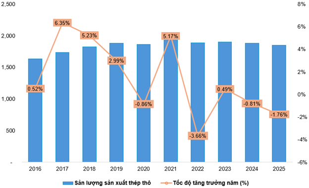 Trên thế giới, nhu cầu thép suy yếu tại nhiều nền kinh tế lớn khiến sản lượng thép thô của các quốc gia chủ chốt giảm so với năm 2024, trong khi tình trạng dư cung kéo dài tiếp tục tạo áp lực giảm giá.