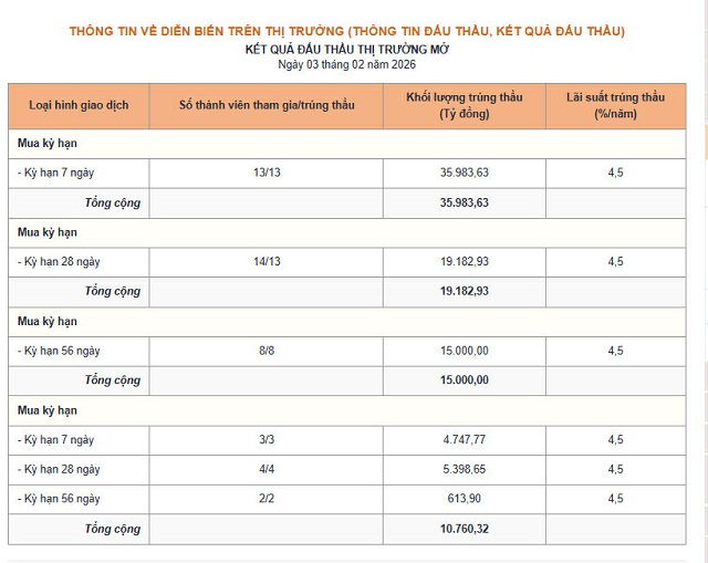 Kết quả đấu thầu thị trường mở trong ngày 03/02/2026