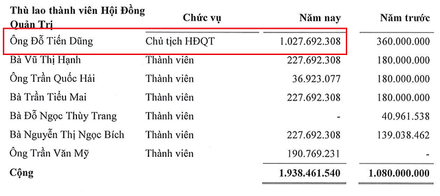 Dù kết quả kinh doanh không như kỳ vọng, thù lao của Chủ tịch Đỗ Tiến Dũng trong năm 2025 vẫn tăng gần gấp 3 lần, đạt hơn 1 tỷ đồng so với mức 360 triệu đồng năm trước. Mức chi trả này phù hợp với phương án đã được cổ đông thông qua tại đại hội thường niên 2025.