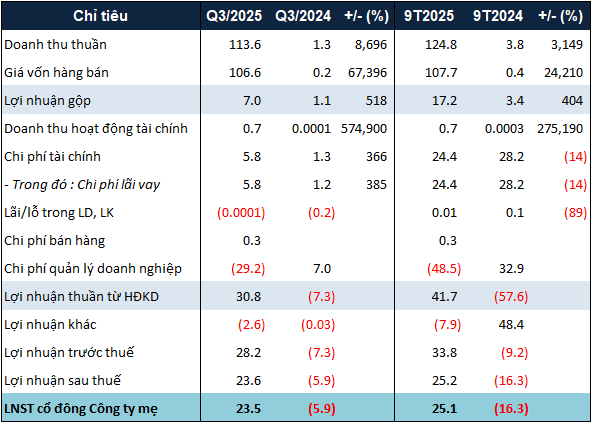 Lũy kế 9 tháng đầu năm, Công ty lãi trước thuế hợp nhất gần 34 tỷ đồng (cùng kỳ lỗ hơn 9 tỷ đồng). Kết quả này đã vượt mục tiêu 25 tỷ đồng đề ra cho cả năm 2025 hơn 35%.