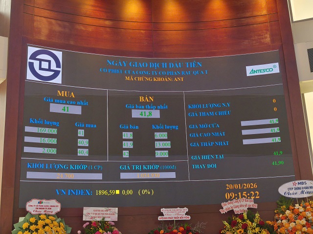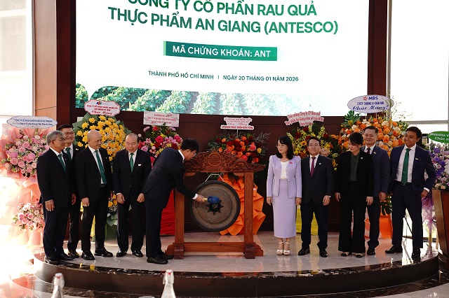 Sáng ngày 20/01, Sở Giao dịch Chứng khoán TPHCM (HOSE) tổ chức Lễ trao quyết định niêm yết cho CTCP Rau quả Thực phẩm An Giang (Antesco, HOSE: ANT), chính thức đưa hơn 24 triệu cp ANT giao dịch trên HOSE với giá tham chiếu 40,900 đồng/cp.
