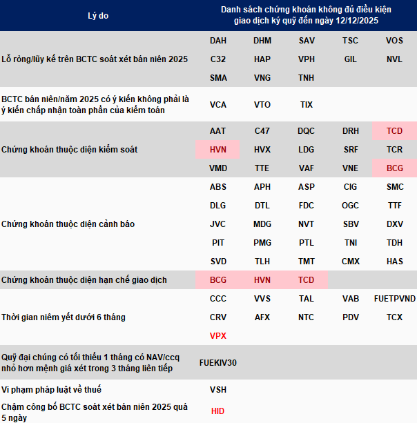 Ngày 12/12, Sở Giao dịch Chứng khoán TPHCM (HOSE) thông báo bổ sung 2 cổ phiếu vào danh sách không đủ điều kiện giao dịch ký quỹ, gồm HID của CTCP Halcom Việt Nam do chậm công bố BCTC, bên cạnh VPX mới niêm yết của CTCP Chứng khoán VPBank.
