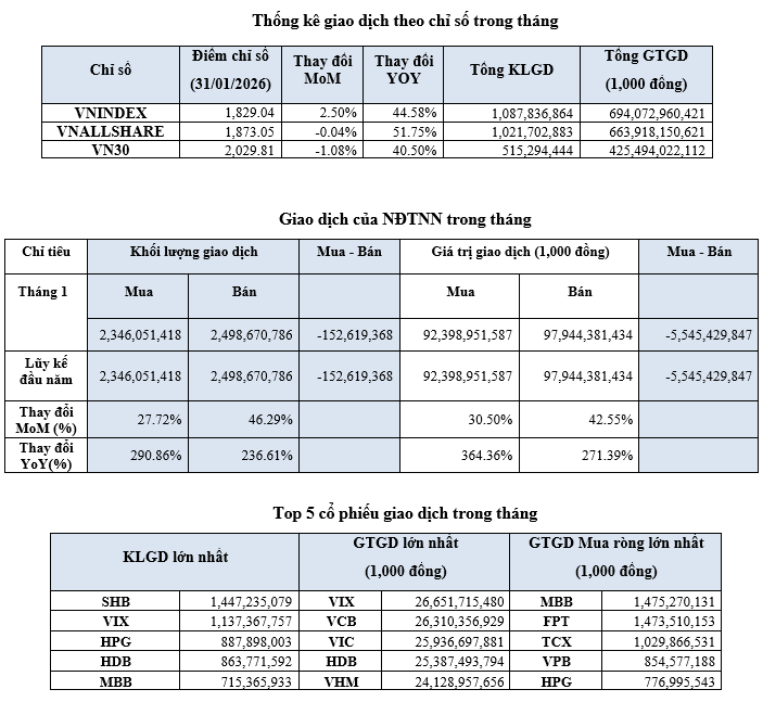 Kết phiên giao dịch 31/01/2026, VN-Index đạt 1,829.04 điểm, VNAllshare-Index đạt 1,873.05 điểm và VN30-Index đạt 2,029.81 điểm. Trong tháng, chỉ VN-Index duy trì đà tăng điểm với mức tăng là 2.5% so với cuối năm 2025, trong khi hai chỉ số còn lại giảm lần lượt là 1.08% và 0.04%.