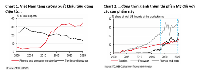Mặc dù năm 2025 liên tục chứng kiến những cú sốc thuế quan, thương mại của Việt Nam vẫn phát triển mạnh mẽ, đạt mức cao kỷ lục 928 tỷ USD, tăng 18% so với cùng kỳ năm trước. Kết quả này có thể xuất phát từ tác động mạnh của việc đẩy nhanh đơn hàng đặt trước nhưng HSBC cho rằng đây chỉ là một phần của câu chuyện. Tác động của việc đẩy nhanh đơn hàng đặt trước sang thị trường Mỹ đã dần giảm bớt, nhưng trong trường hợp của Việt Nam, tăng trưởng xuất khẩu vẫn mạnh mẽ hơn nhiều so với các nước khác, với tốc độ tăng 30% so với cùng kỳ tính theo bình quân động 3 tháng (3mma). Nguyên nhân không chỉ do đẩy nhanh đơn hàng đặt trước mà vấn đề còn xoay quanh tầm quan trọng của việc xuất khẩu những sản phẩm "phù hợp".