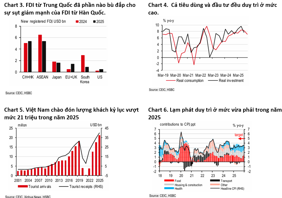HSBC dự báo tăng trưởng GDP Việt Nam sẽ đạt 6.7% vào năm 2026 và lạm phát duy trì vừa phải ở mức 3.5%.