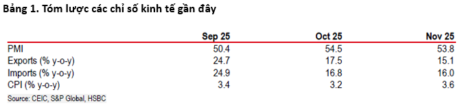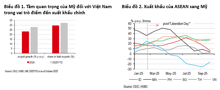 Xuất khẩu sang Mỹ tăng mạnh bất chấp mức thuế 20%, đưa thị phần của Mỹ trong cơ cấu xuất khẩu Việt Nam lên 32%. Tuy nhiên, HSBC cảnh báo rủi ro vẫn lớn khi Việt Nam chờ phán quyết cuối cùng về thuế trung chuyển 40% và thuế ngành bán dẫn.