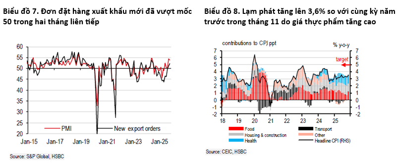 Bên cạnh tăng trưởng, lạm phát cũng là vấn đề đáng lưu ý. Đà tăng lạm phát chính trong tháng 11 tăng lên 0.5% so với tháng trước, tương đương với lạm phát 3.6% so với cùng kỳ năm trước, cao hơn mức dự báo của thị trường (HSBC: 3.4%; Bloomberg: 3.4%). Nguyên nhân chính là bởi giá lương thực tăng cao, do tình hình lũ lụt gần đây làm gián đoạn nguồn cung lương thực, đặc biệt giá rau củ tăng 12% so với tháng trước.