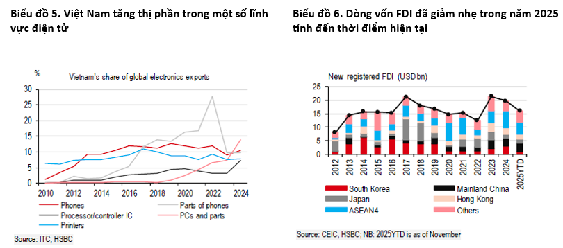 HSBC nhận định tác động thực tế của thuế quan có phần nhẹ hơn lo ngại ban đầu nhưng rủi ro chưa chấm dứt. Việt Nam là nước có thặng dư thương mại với Mỹ lớn thứ 3 thế giới, nên luôn nằm trong nhóm rủi ro cao nhất ở ASEAN. Quyết định cuối cùng về thuế trung chuyển 40% và thuế ngành bán dẫn vẫn đang chờ đợi. Đây sẽ là yếu tố then chốt định hình triển vọng thương mại 2026.
