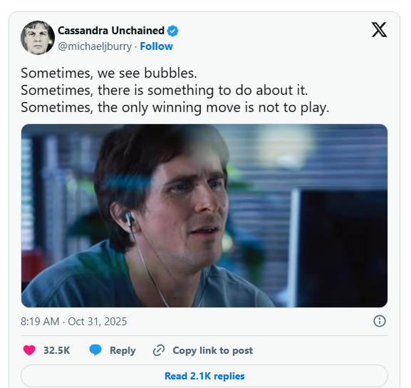 Người đàn ông nổi tiếng từ bộ phim "The Big Short" vừa đăng bài trên X lần đầu tiên kể từ tháng 4/2023 vào ngày 30/10. Ông chia sẻ một hình ảnh từ bộ phim với diễn viên Christian Bale, người đóng vai ông Burry trong "The Big Short", đang nhìn chằm chằm vào màn hình máy tính với vẻ khó tin.