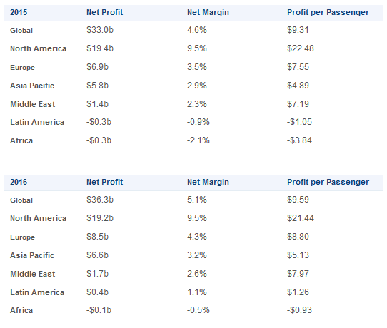 IATA ước tính các hãng hàng không trong năm 2016 sẽ đạt lợi nhuận ròng 36.3 tỷ USD, tỷ suất lợi nhuận ròng trung bình ngành tăng lên 5.1%. IATA cũng nâng mức dự báo tăng trưởng lợi nhuận của các hãng hàng không trong năm 2015 lên 33 tỷ USD so với 29.3 tỷ USD của dự báo cũ hồi tháng 6.