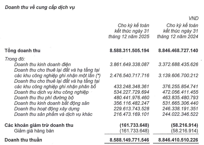 Cơ cấu doanh thu 2025 của IDC cho thấy mảng kinh doanh điện đóng góp nhiều nhất với gần 3,862 tỷ đồng, tăng 15%; trong khi doanh thu cho thuê lại đất và hạ tầng KCN gần 2,477 tỷ đồng, giảm 21%.