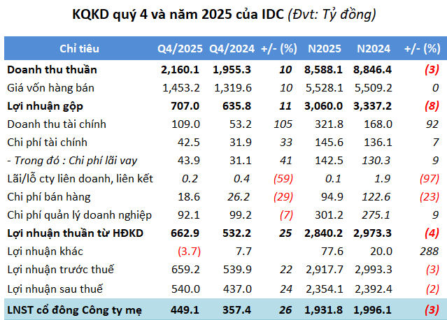 Quý 4/2025, Tổng Công ty IDICO - CTCP (HNX: IDC) đạt doanh thu thuần hơn 2,160 tỷ đồng, lãi ròng hơn 449 tỷ đồng, tăng lần lượt 10% và 26% so với cùng kỳ.