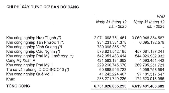 Hàng tồn kho hơn 1.3 ngàn tỷ đồng, giảm 7%, tập trung lớn tại dự án khu dân cư nhà ở công nhân Hựu Thạnh với giá trị gần 833 tỷ đồng. Trong khi đó, chi phí xây dựng cơ bản dở dang tăng mạnh 46%, lên hơn 6.75 ngàn tỷ đồng, do phát sinh chi phí đầu tư tại nhiều dự án trọng điểm. Cụ thể, chi phí tại KCN Vinh Quang hơn 739 tỷ đồng; KCN Tân Phước 1 tăng vọt lên hơn 934 tỷ đồng, gấp 139 lần đầu năm; cảng Mỹ Xuân A gần 422 tỷ đồng, gấp 103 lần.