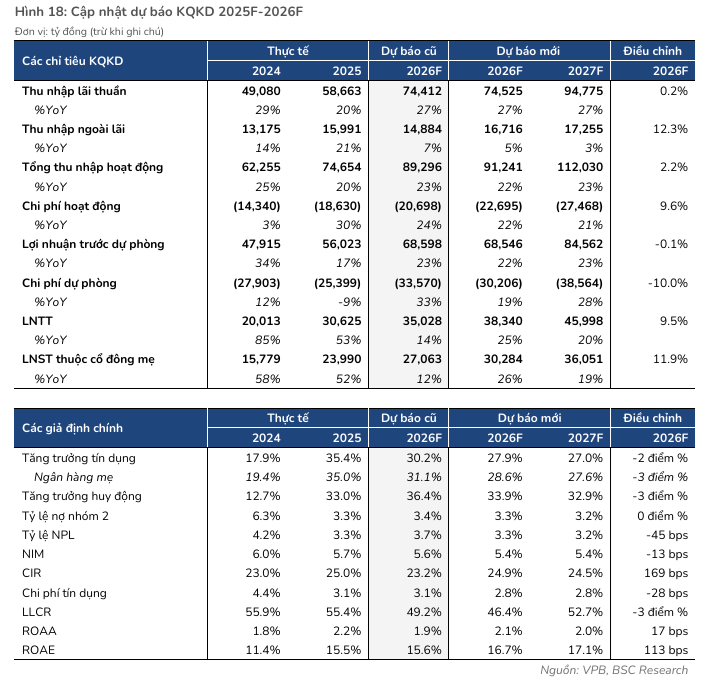Thứ hai là lợi thế cạnh tranh trong việc huy động vốn từ các định chế tài chính quốc tế. VPB đã huy động gần 2.4 tỷ USD nguồn vốn dài hạn từ nước ngoài trong 2025 nhờ sự kết nối của cổ đông chiến lược SMBC. Đây là con số cao nhất ngành và BSC kỳ vọng xu hướng này tiếp diễn trong 2026.