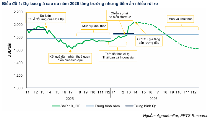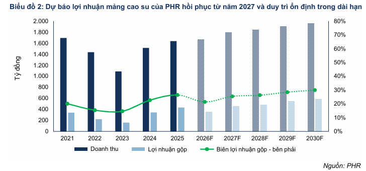 Cụ thể, lợi nhuận sau thuế đạt 1,074 tỷ đồng, tăng 109% so với cùng kỳ. Lãi gộp mảng cao su dự báo giảm 18% chủ yếu do cơ cấu mủ đầu vào thay đổi, tăng tỷ trọng sản lượng mủ thu mua khiến giá vốn tăng. Thêm nữa, sản lượng tiêu thụ dự báo giảm xấp xỉ 2% so với mức cao năm 2025 (cao do tiêu thụ hàng tồn kho). Giá bán dự kiến khả quan khi tăng 4% trước lo ngại thiếu hụt nguồn cung cao su tự nhiên toàn cầu.
