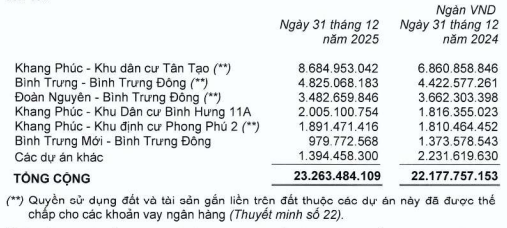 Trên bảng cân đối kế toán, tổng tài sản của KDH tại thời điểm 31/12/2025 ghi nhận gần 34.1 ngàn tỷ đồng, tăng gần 11% so với đầu năm. Lượng tiền nắm giữ ngắn hạn giảm hơn 18%, còn gần 2.8 ngàn tỷ đồng. Ngược lại, hàng tồn kho lại tăng gần 5%, lên gần 23.3 ngàn tỷ đồng, chiếm hơn 68% tổng tài sản.