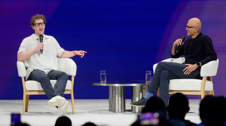 Nhà sáng lập kiêm CEO Meta, ông Mark Zuckerberg (trái), và CEO Microsoft, ông Satya Nadella. Kết quả kinh doanh xuất sắc của các công ty này đã thúc đẩy đà tăng của nhóm cổ phiếu công nghệ. Ảnh: Jeff Chiu/AP