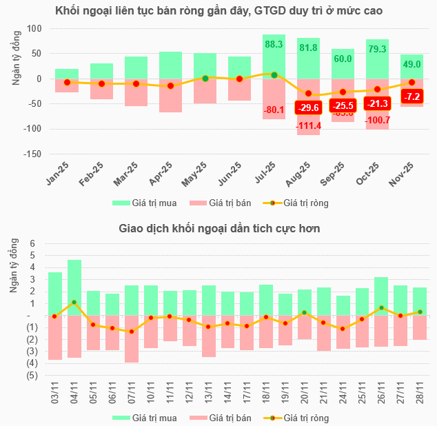 Kết quả, khối ngoại bán ròng gần 7.2 ngàn tỷ đồng, đánh dấu tháng bán ròng thứ 9 tính từ đầu năm 2025 và lập chuỗi bán ròng 4 tháng liên tiếp, nâng mức lũy kế bán ròng từ đầu năm vượt 113 ngàn tỷ đồng.