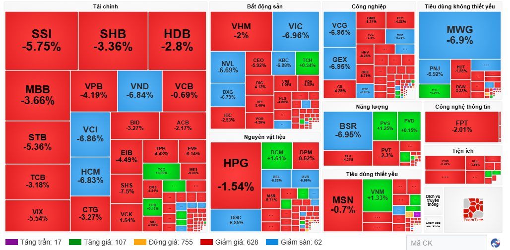 Độ rộng toàn thị trường với sắc đỏ áp đảo khi bên bán có 690 mã giảm và bên mua có 124 mã tăng. Tương tự, rổ VN30 với sắc đỏ áp đảo với 27 mã giảm và 3 mã tăng.
