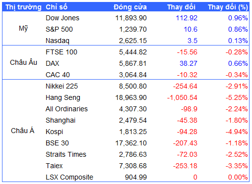 Diễn biến của các chỉ số chứng khoán chính trên thế giới ngày 10/11: