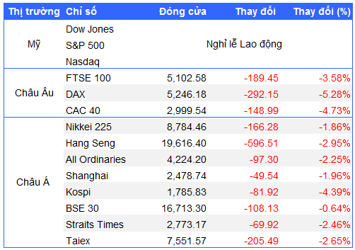 Diễn biến của các chỉ số chứng khoán chính trên thế giới ngày 05/09: