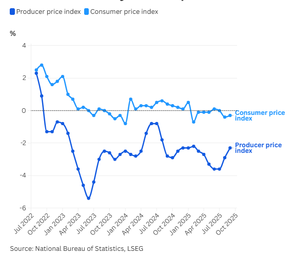 Xu hướng giảm giá sản xuất đã kéo dài gần ba năm, gây áp lực lớn lên khả năng sinh lời của các nhà sản xuất Trung Quốc. Các doanh nghiệp này đang phải đối mặt với niềm tin tiêu dùng èo uột trong nước và gián đoạn sản xuất do các chính sách thương mại của Mỹ.