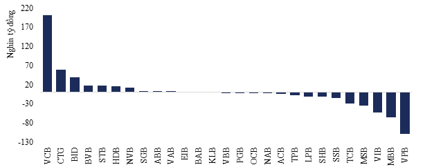 Ở chiều ngược lại, nhóm ngân hàng vay ròng lớn có diễn biến kém tích cực và phân hóa rõ rệt hơn. Các trường hợp như VPB, SSB, VIB, MSB, hay SHB ghi nhận mức sinh lời âm trong cùng giai đoạn. Điểm chung của nhóm này là trạng thái vay ròng trên thị trường liên ngân hàng và mức độ phụ thuộc tương đối cao vào nguồn vốn này (trên 18%). Tuy vậy, mối quan hệ này không hoàn toàn rõ khi vẫn có những ngoại lệ đáng chú ý: một số ngân hàng vay ròng như MBB (+11.9%) hay TPB (+2.3%) vẫn ghi nhận hiệu suất khả quan, trong khi HDB – dù ở trạng thái cho vay ròng – lại có diễn biến ngược lại.
