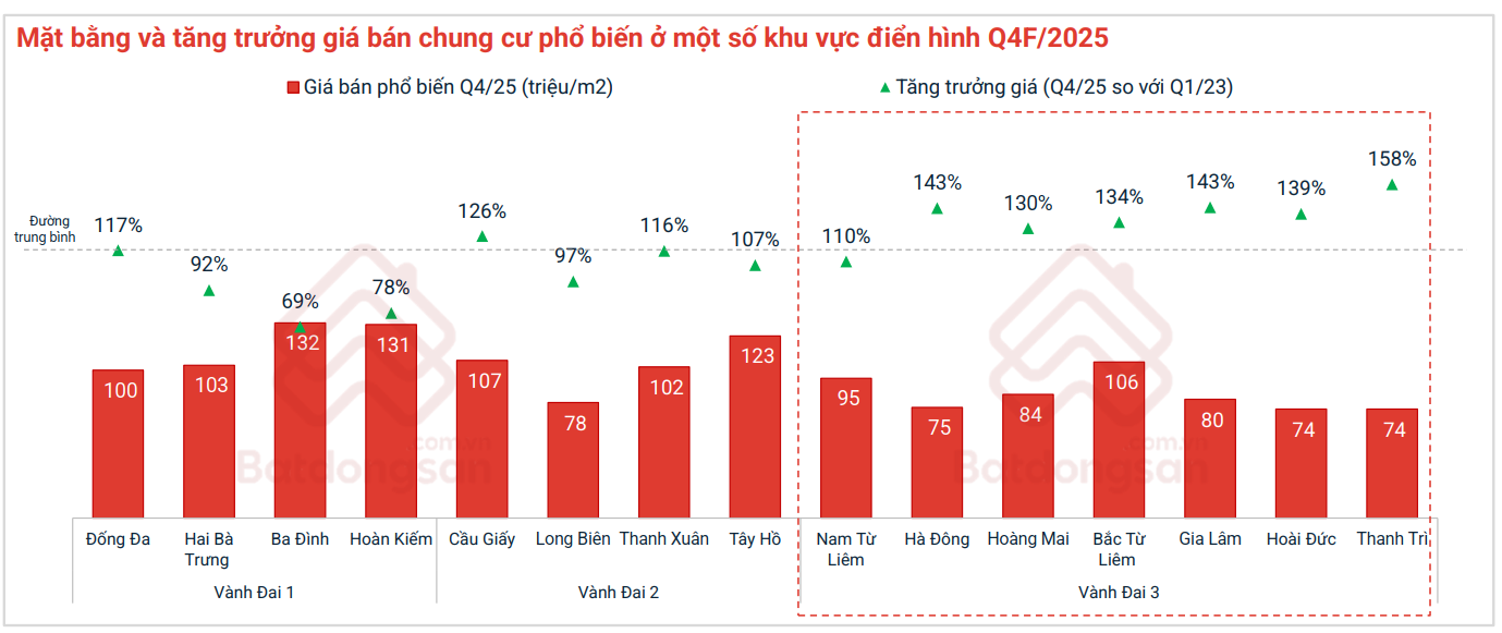 Ở diễn biến giá, mức tăng mạnh nhất trong quý 4/2025 không xuất hiện ở nội đô, mà nằm tại các địa bàn thuộc vành đai 3. Thanh Trì cũ ghi nhận mức giá rao bán căn hộ phổ biến 74 triệu đồng/m2, tăng tới 158% so với quý 1/2023. Gia Lâm cũ (80 triệu đồng/m2) và Hà Đông cũ (75 triệu đồng/m2) đều có mức tăng trưởng 143%, trong khi Hoài Đức cũ đạt 75 triệu đồng/m2, tương ứng mức tăng 139%, cho thấy xu hướng dòng tiền đang ưu tiên các khu vực có mặt bằng giá thấp và sự hình thành các đại đô thị mới.