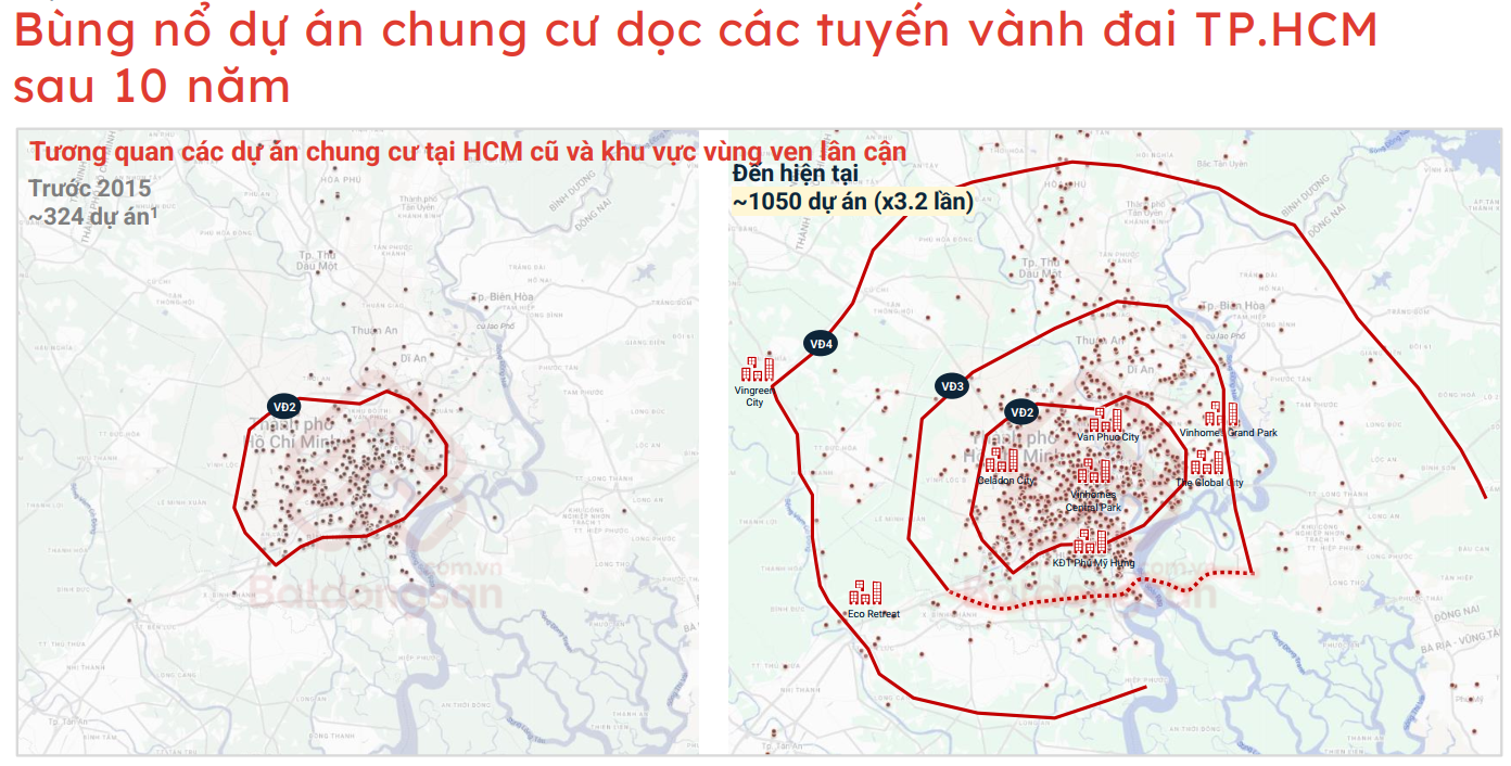 “Trung tâm không còn giữ vai trò trung tâm duy nhất. Các vành đai tạo ra những cực phát triển mới tại Thủ Đức, Dĩ An, Thuận An, Thủ Dầu Một, Nhà Bè đánh dấu giai đoạn giãn nén đô thị mạnh nhất từ trước đến nay”, ông Tuấn nhận định.