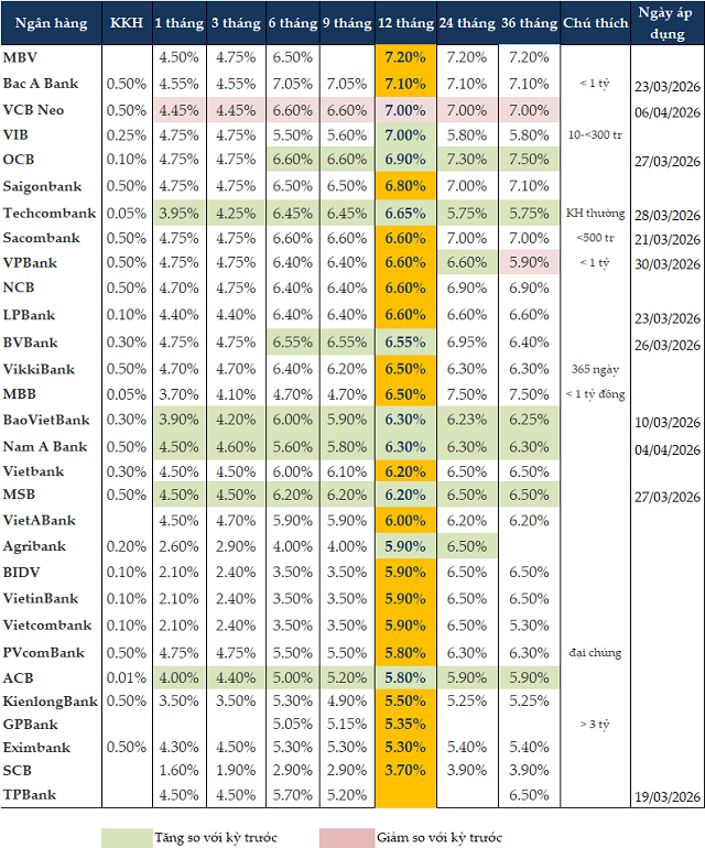 Ở kỳ hạn 12 tháng, MBV giữ mức lãi suất cao nhất ở 7.2%/năm. Kế đó là Bac A Bank ở mức 7.1%/năm. Xếp ngay sau đó, VIB và VCB Neo có mức lãi suất 7%/năm.