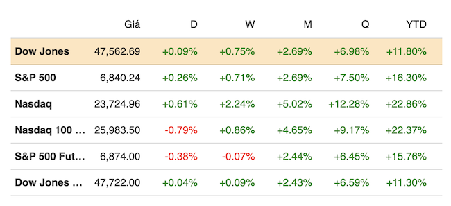 Kết thúc phiên giao dịch ngày 31/10, chỉ số Nasdaq Composite cộng 0.61% lên 23,724.96 điểm, chỉ số S&P 500 tiến 0.26% lên 6,840.20 điểm. Chỉ số Dow Jones nhích 40.75 điểm (tương đương 0.09%) lên 47,562.87 điểm.