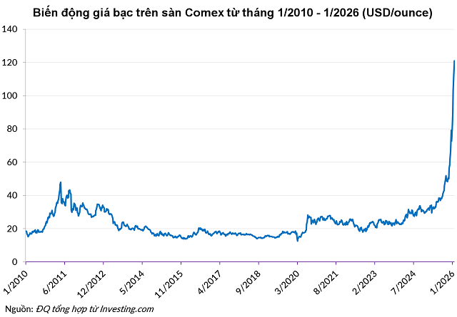 Thế nhưng khi Comex liên tục nâng yêu cầu ký quỹ với hợp đồng tương lai bạc vào cuối năm 2025, giá bạc chỉ giảm mạnh trong một vài phiên rồi lại nhanh chóng vùng lên mạnh mẽ. Sang tháng 1/2026, giá bạc đã vượt các mốc 110 rồi 120 USD/ounce.