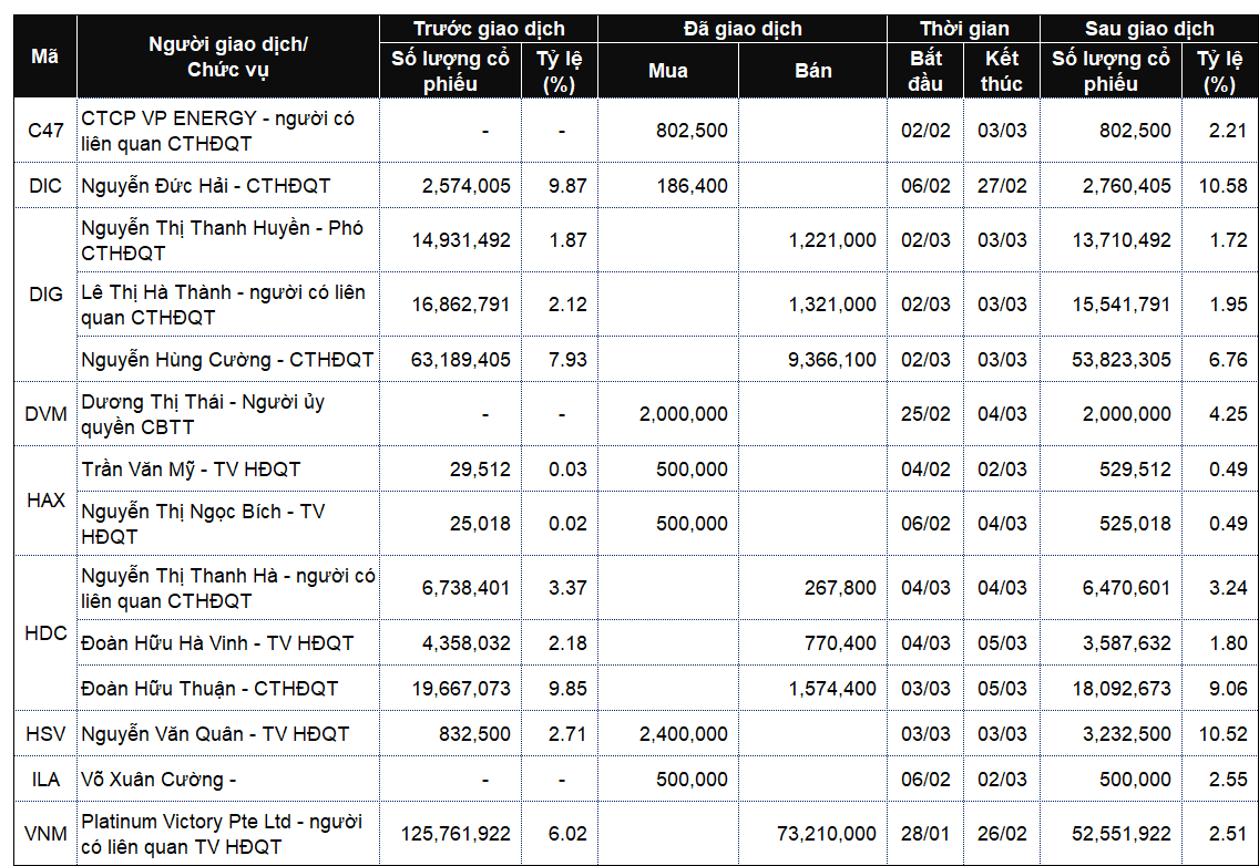Trong phiên từ ngày 2-6/3/2026 cho thấy, lãnh đạo và người thân mua bán nhộn nhịp chiều đăng ký. Trong khi đó, nhiều giao dịch thành công đáng chú ý tại DIG, DVM và HSV.