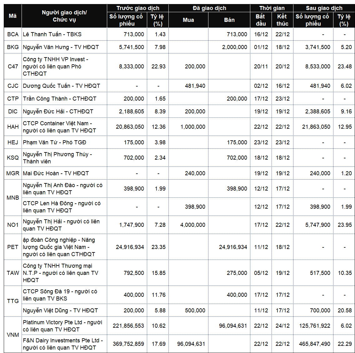 Danh sách lãnh đạo công ty và người thân giao dịch từ ngày 22-26/12/2025