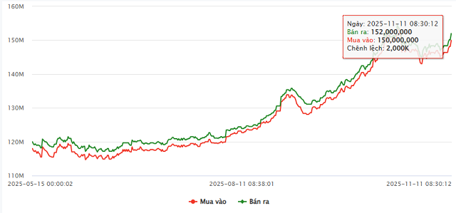 Sau 2 tuần gần như giảm và đi ngang, sáng 11/11, giá vàng miếng SJC lấy lại đà tăng. Công ty SJC niêm yết giá mua - bán ở mức 150-152 triệu đồng/lượng, cùng tăng 1.8 triệu đồng/lượng mỗi chiều so với hôm trước.